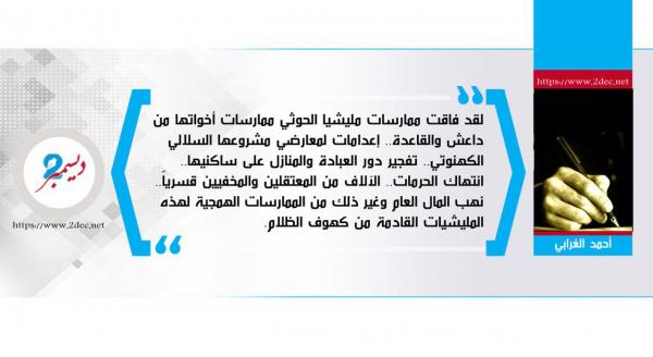 لقد فاقت ممارسات مليشيا الحوثي ممارسات أخواتها من داعش والقاعدة.. إعدامات لمعارضي مشروعها السلالي الكهنوتي.. تفجير دور العبادة والمنازل على ساكنيها.. انتهاك الحرمات.. الآلاف من المعتقلين والمخفيين قسرياً.. نهب المال العام وغير ذلك من الممارسات الهمجية لهذه المليشيات القادمة من كهوف الظلام.