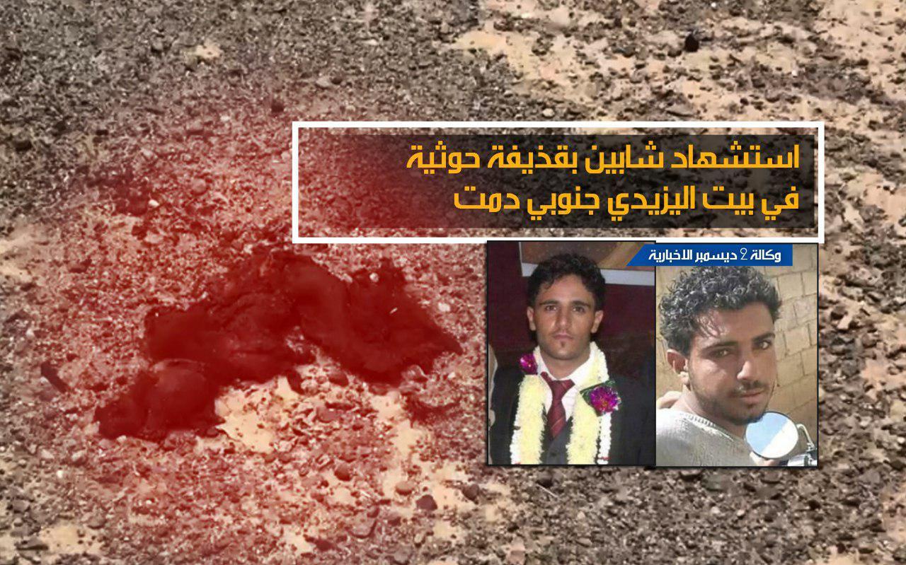 استشهد شابان، اليوم الاثنين 24 ديسمبر 2018، بقذيفة مدفعية أطلقتها مليشيا الحوثي الإرهابية المدعومة إيرانياً، جنوب مدينة دمت شمال محافظة الضالع. وقال مصدر محلي لـ